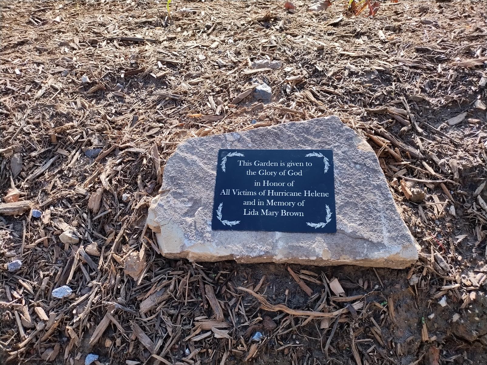 Directly across the parking lot from the church you will find our Memorial Gardens given in honor of the victims of Hurricane Helene. There is a meditation area with two stone benches, a fire pit and sitting area, and a short walking path. Also in the Gardens is the Rebecca Henderson Memorial Cremains Garden where the ashes of members of the parish are laid to rest. The public is welcome to use these gardens for meditation, prayer, and rest.